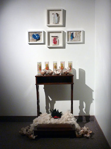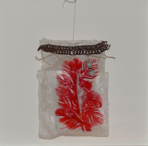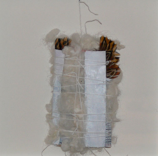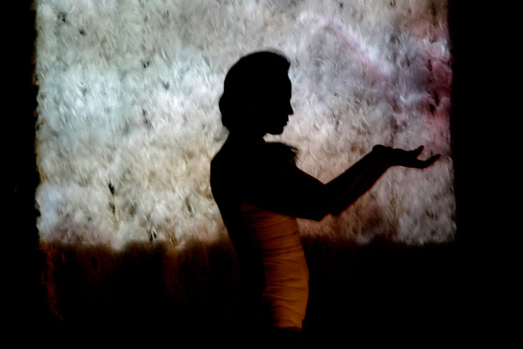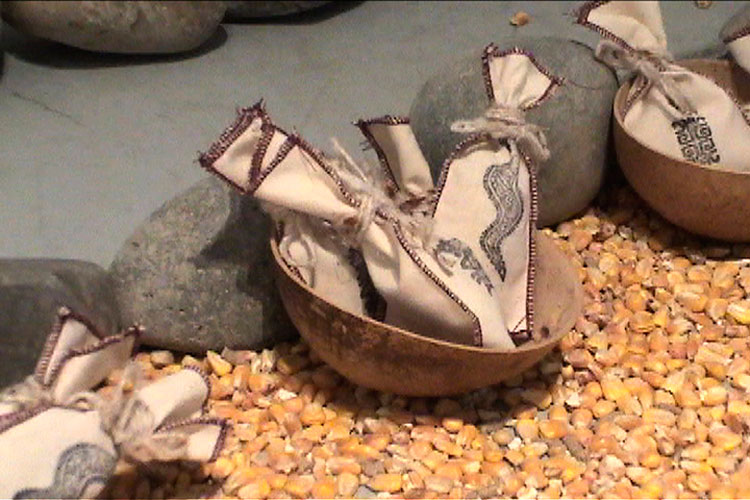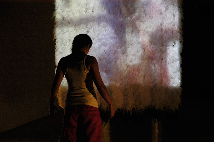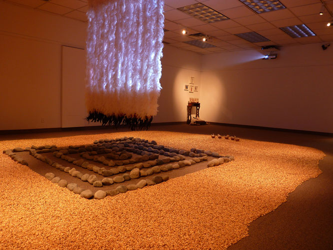 Installation, projection vidéo, performance. Écran de plumes, pierres, calebasses, maïs, laine.