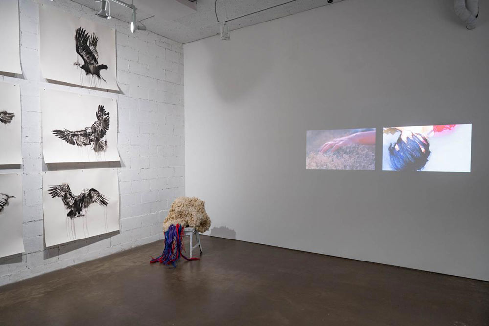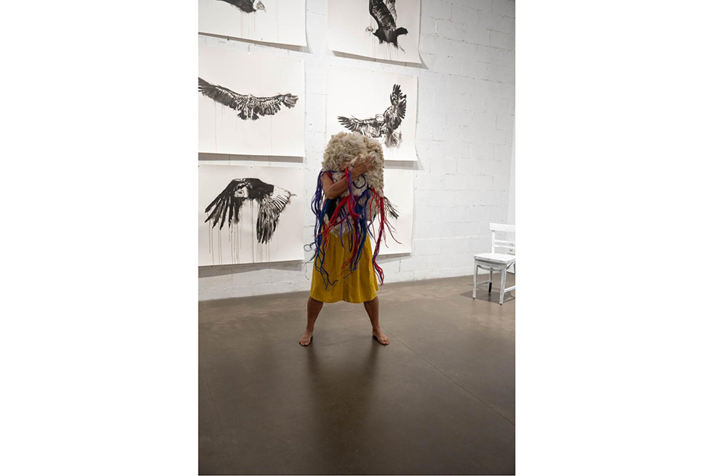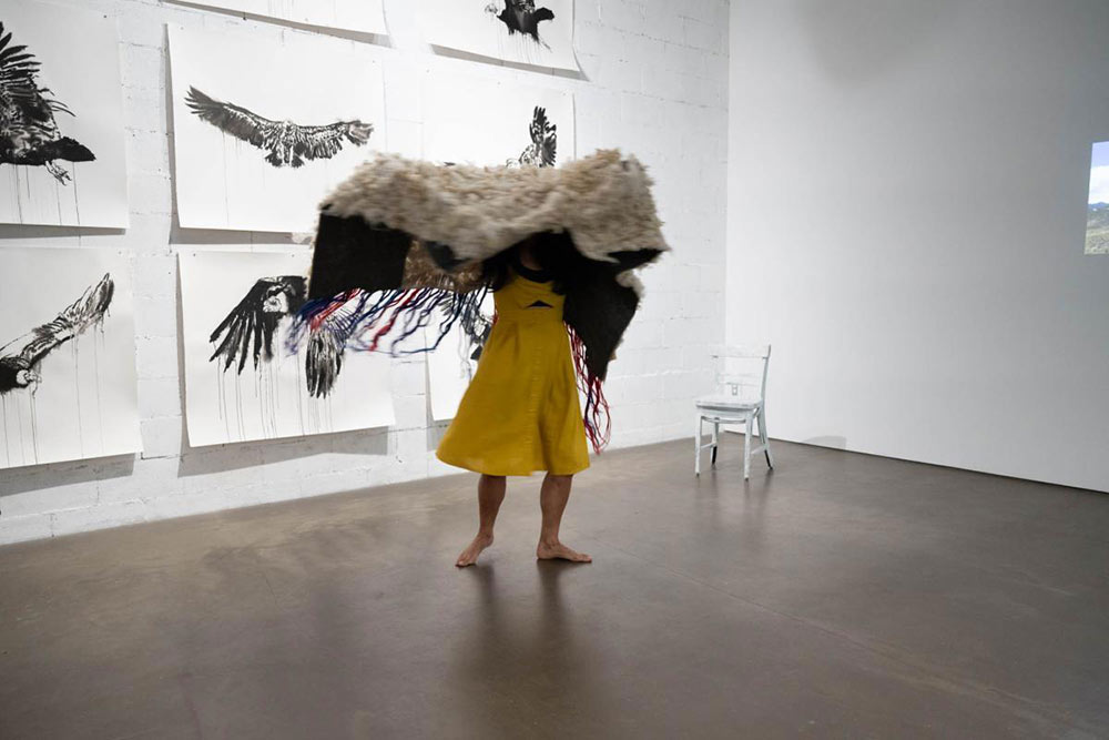 Le processus de création de cette oeuvre interdisciplinaire (installation, vidéo, dessins, performance) m’a conduit, du côté Colombien, vers les hautes montagnes de Sumapaz et Rabanal, la région de Chorro de Oro (Guateque) et le village de Sutatausa. Du côté Québécois, vers la région du Saguenay-Lac-Saint-Jean et Tadoussac. Habiter ces paysages, ces territoires autant géographiques qu’affectifs, m’a permis d’explorer mon propre corps-territoire ainsi que d’autres corps-territoires humains et non-humains avec lesquels je m’identifie comme femme-artiste-immigrante. Le corps est un territoire susceptible de devenir un espace de résistance où d’autres mondes possibles, surprenants et imprévisibles peuvent être créés. Habiter ces espaces nous a permis d’expérimenter différentes façons d’écouter, de marcher, de voir, de toucher, de sentir et de penser. J’ai créer cette œuvre comme un territoire, un corps-territoire de poésie et de résistance fait de textures, de sons, d’images et d’actions.