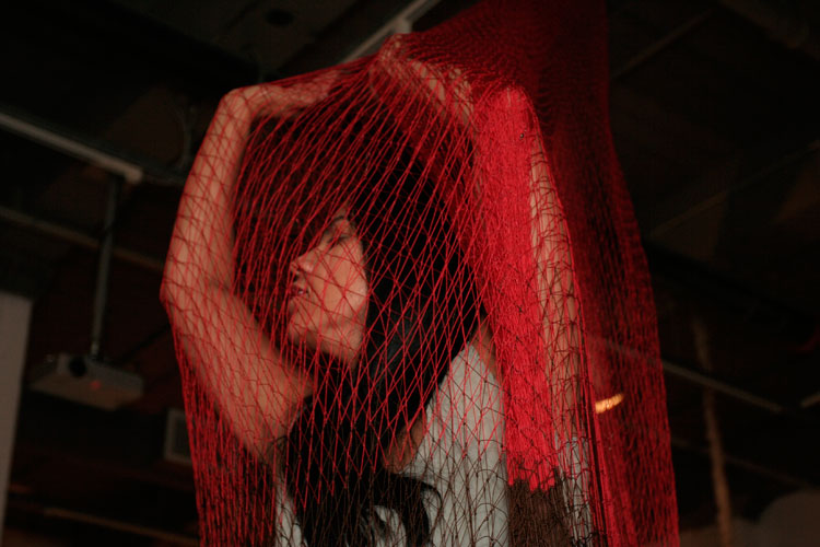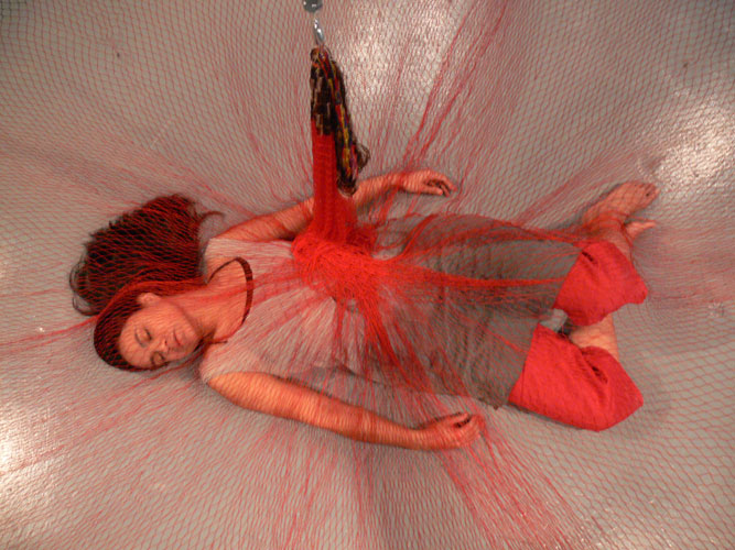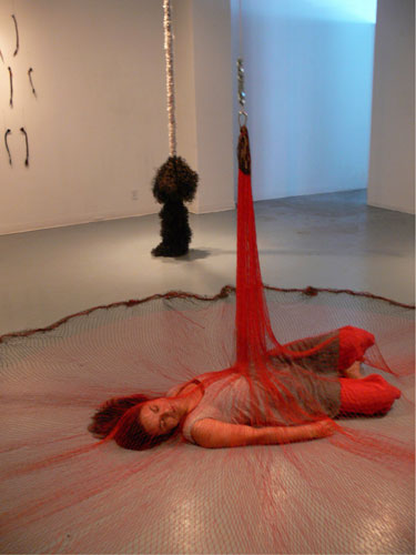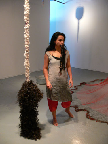 Installation, projection vidéo, performance. Filet de pêche, cheveux artificiels, eau, laine de mouton, objets.