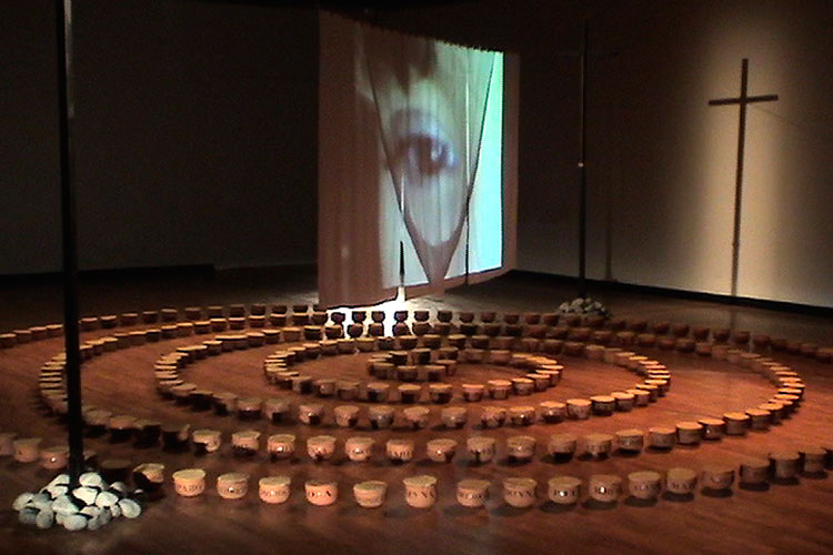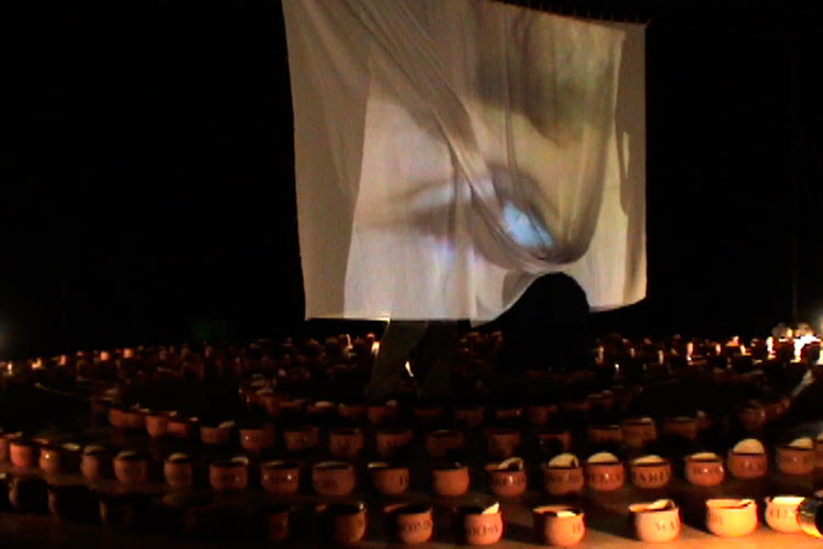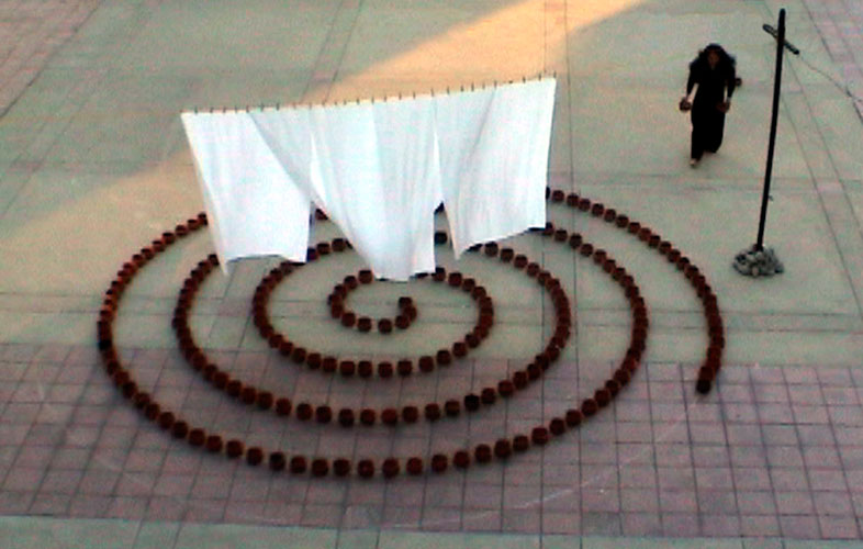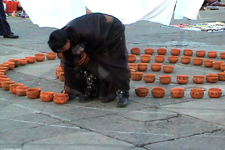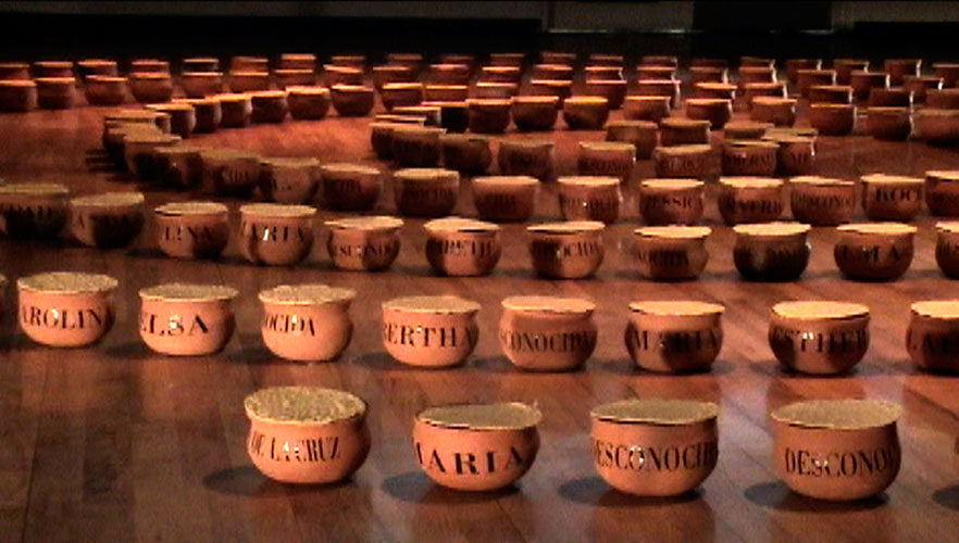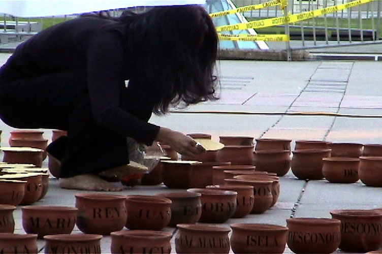 Installation-vidéo-performance inspirée de ce qui ont longtemps été considérés comme des faits isolés mais qui peu à peu ont pris la forme d’une hécatombe historique, d’un holocauste contre le genre féminin: les assassinats violents depuis 1993 de plus de 300 femmes dans la ville de Ciudad Juarez, Mexique. Située sur ces terres de personne et de tous qu’est la frontière, Ciudad Juarez est une ville de transit où arrivent des milliers de femmes poursuivant un même rêve: atteindre le «paradis». Cette œuvre imposante, à la fois déroutante et bouleversante, agence céramique, bois, corde, tissus, pierres, tortillas de mais; et une vidéo où le désert, hanté par des silhouettes féminines, est une métaphore de l’isolement, de l’esseulement et du déracinement identitaire.